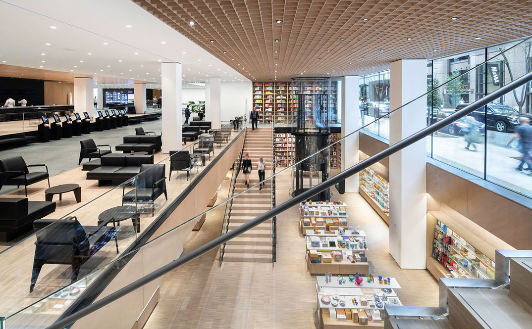 In collaboration with Gensler, DS+R reimagined the iconic museum once again in 2017, expanding its gallery space by 30%. Visitors now navigate a new circulation path that weaves through galleries spanning three buildings along 53rd Street. The existing lobby was transformed into a light-filled, two-story space by reconfiguring ticketing and coat check, freeing up the central axis. Designed as an open and inviting entry, the lobby includes art installations and remains free and accessible to all. Below, the flagship Museum Store occupies a newly designed double-height space, remaining visible from the street through a glazed façade.
