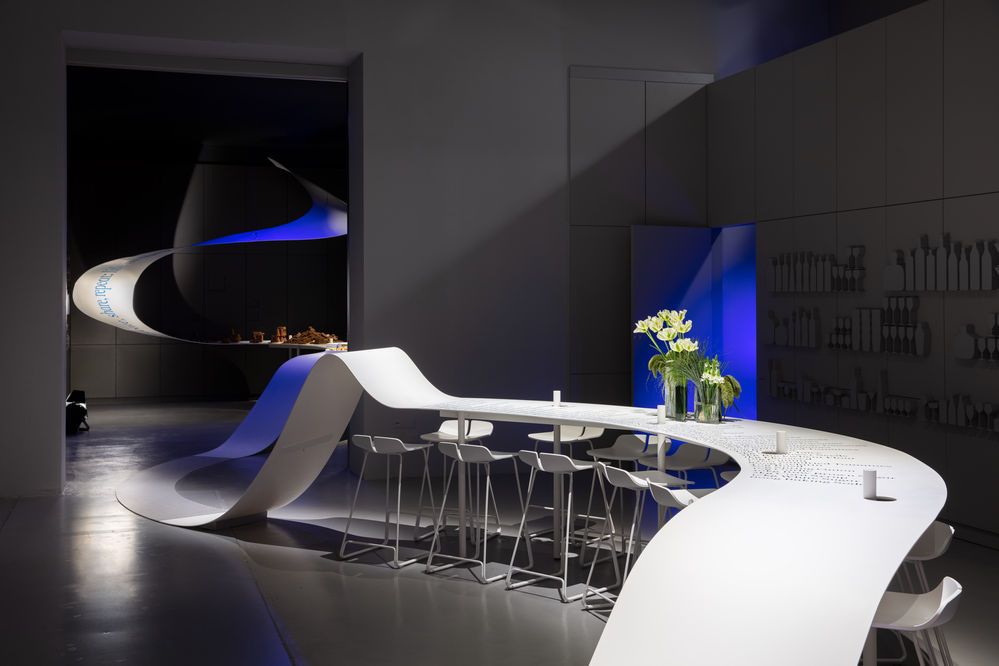 Samsung’s 24hr. Kitchen installation, presented during the 2019 Fuorisalone in Milan, showcased built-in kitchen appliances with the concept of celebrating the kitchen as the heart of the home in our ever-evolving 24/7 lifestyle. The exhibition unfolded across three interconnected rooms, each featuring a unique kitchen design representing morning, day, and evening. Every space was distinctly furnished to reflect its theme and time of day. A continuous Corian solid surface ribbon flowed through all three rooms, seamlessly transforming into a table at moments in front of the kitchen counters to serve visitors curated morsels by acclaimed food designer Laila Gohar.